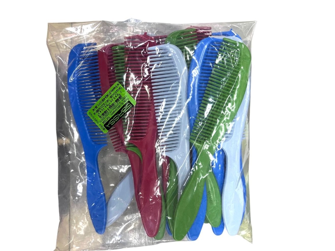 Pente em plástico, diversas cores, penteia o cabelo e massageia o couro cabeludo. Pode ser usado no cabelo molhado ou seco. Formato de cabo largo, anatômico.
