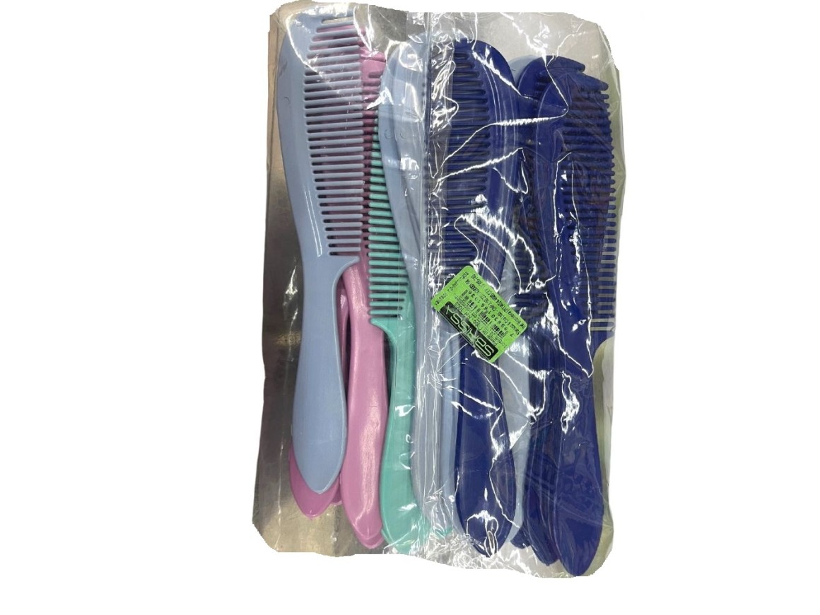 Pente em plástico, diversas cores, penteia o cabelo e massageia o couro cabeludo. Pode ser usado no cabelo molhado ou seco. Formato de cabo largo, anatômico. Leve e fácil de usar.