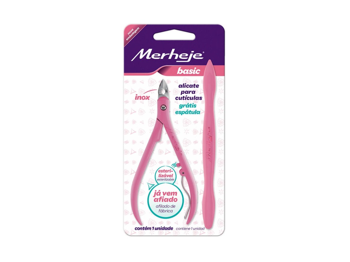 Alicate Cutícula Merheje Basic + Espátula Rosa Aço Inox