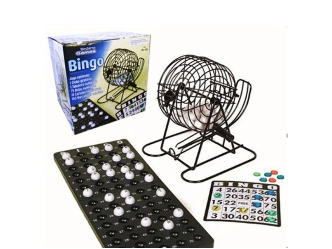 Jogo contendo: 1 Globo giratório em metal 1 Tabuleiro numerado 75 bolas numeradas 18 Cartelas reutilizáveis 150 Marcadores coloridos
