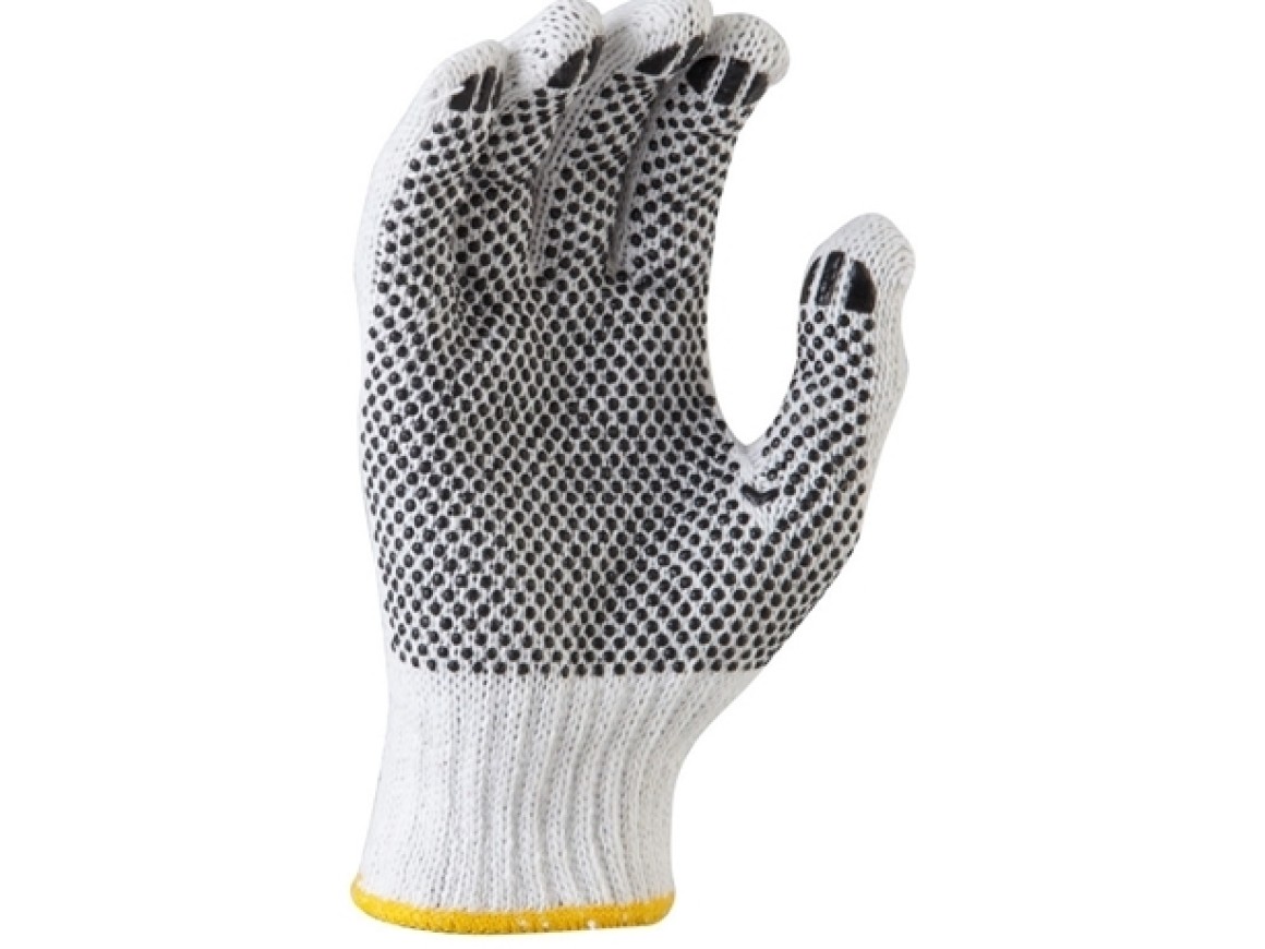 Luva de segurança confeccionada em fibras naturais e sintéticas, com pigmento em PVC na região palmar e face palmar dos dedos, punho com inserções de fibras elásticas e acabamento final em fibras sintéticas.