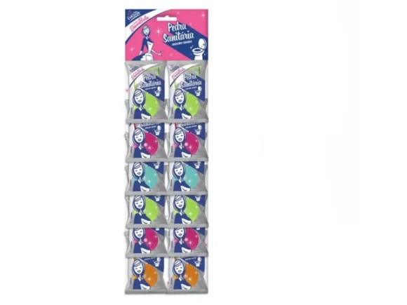 A Pedra Sanitária Novo Frescor mantém seu vaso sanitário limpo e perfumado. Fragrância: Mista (Lavanda, Tutti-Frutti, Eucalipto e Frutas Tropicais). Modo de Usar: Retirar a pedra sanitária da embalagem. 2 - Anexar a haste plástica que acompanha o produto. 3 - Pendure na extremidade do vaso sanitário. Quantidade:12 Unidades