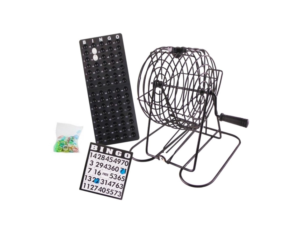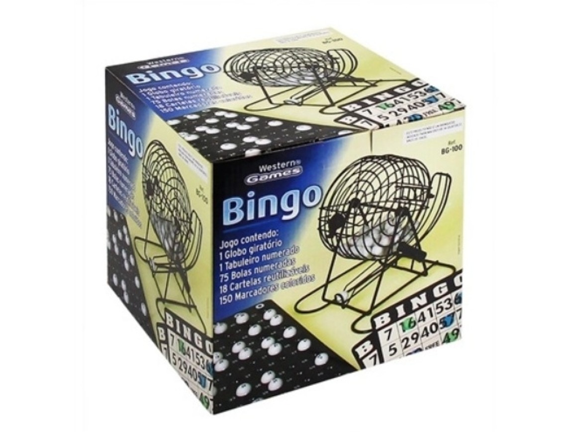 Jogo contendo: 1 Globo giratório em metal 1 Tabuleiro numerado 75 bolas numeradas 18 Cartelas reutilizáveis 150 Marcadores coloridos