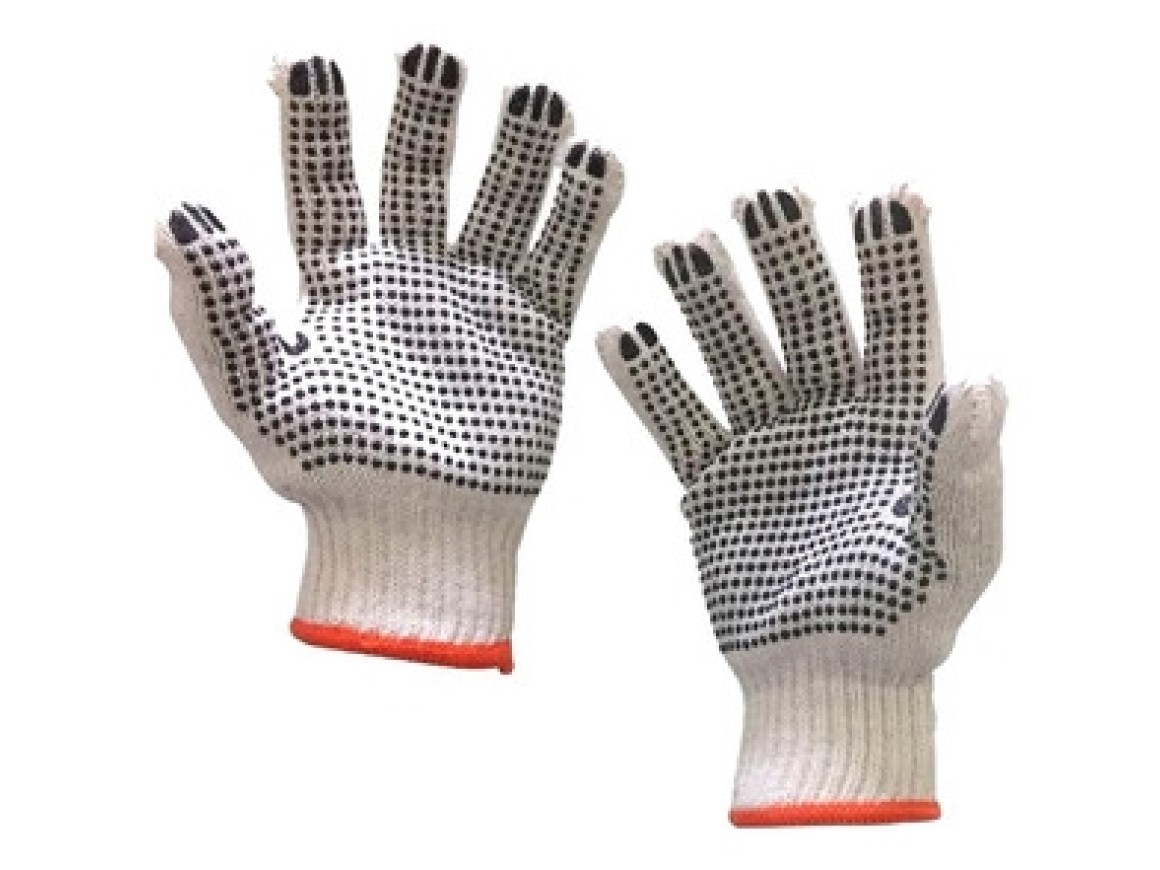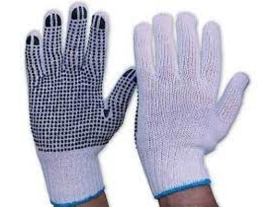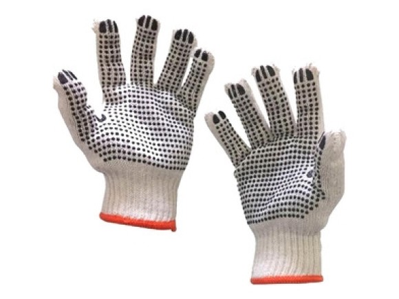 Luva de segurança confeccionada em fibras naturais e sintéticas, com pigmento em PVC na região palmar e face palmar dos dedos, punho com inserções de fibras elásticas e acabamento final em fibras sintéticas.