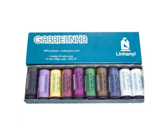 10 Linhas Costura Gabrielinha (CORES SORTIDAS) Para costura de camisas, lingeries, malhas, blusas, agasalhos, etc., em tecidos leves e médios, de composição mista ou sintética. O poliéster tem a vantagem de dar elasticidade ao ponto, sendo mais resistente.
