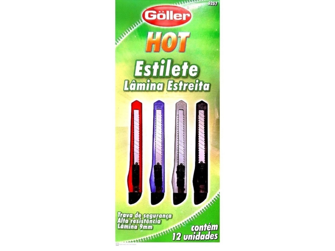 12 unidades Estilete de plástico para lâmina estreita 9mm com trava de segurança. A cor será enviada conforme disponibilidade de estoque. Contém: 12 estiletes com a lâmina inclusa. Tamanho aproximado: 13cm