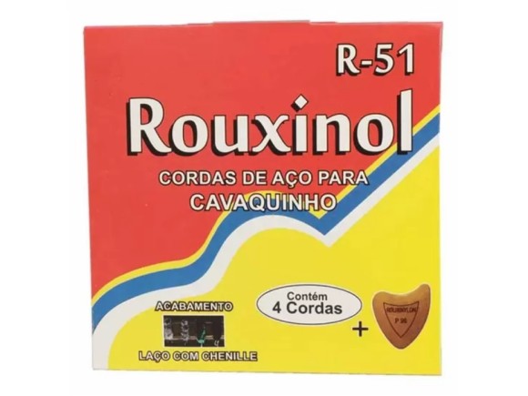 Corda para cavaquinho aco c/4+palheta r-51 / un / rouxinol O ENCORDOAMENTO ROUXINOL R51 É CONSIDERADO UM DOS MELHORES JOGOS DE CORDA PARA CAVAQUINHO QUE EXISTE. PRODUZIDO PELA PRÓPRIA ROUXINOL O ENCORDOAMENTO R51 SÃO FEITAS DE AÇO COM ACABAMENTO EM LAÇO CHENILLE, PRODUZINDO UM SOM MAS ACÚSTICO, PARECENDO COM O SOM E TIMBRE ORIGINAL DO SEU INSTRUMENTO. AS CORDAS LISAS (RÉ E SI) SÃO DE AÇO INOXIDÁVEL E NÃO ENFERRUJAM. OS BORDÕES (SOL E RÉ) COM ALMA DE AÇO CARBONO ESTANHADO, ENCAPADA COM METAL PRATEADO. O COMPRIMENTO MÍNIMO DESSAS CORDAS SÃO DE 55CM.